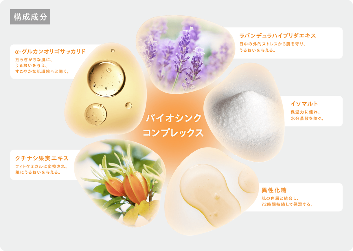 肌の常在菌“マイクロバイオーム”に着目し、それらをすこやかに育てるための独自の“美肌菌ケア”「バイオシンクコンプレックス」と「バイオシンクラメラ構造」を採用。